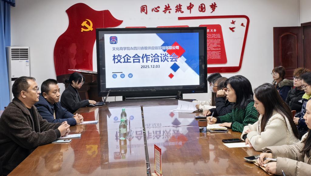 2025年12月3日下午,文化商学院与四川睿舰供应链管理有限公司、四川省食品生产经营安全协会在温故楼三楼会议室开展校企合作洽谈。会长罗平、总经理蒋舰强、院长曾兴及学院相关专业师生代表共同参会。