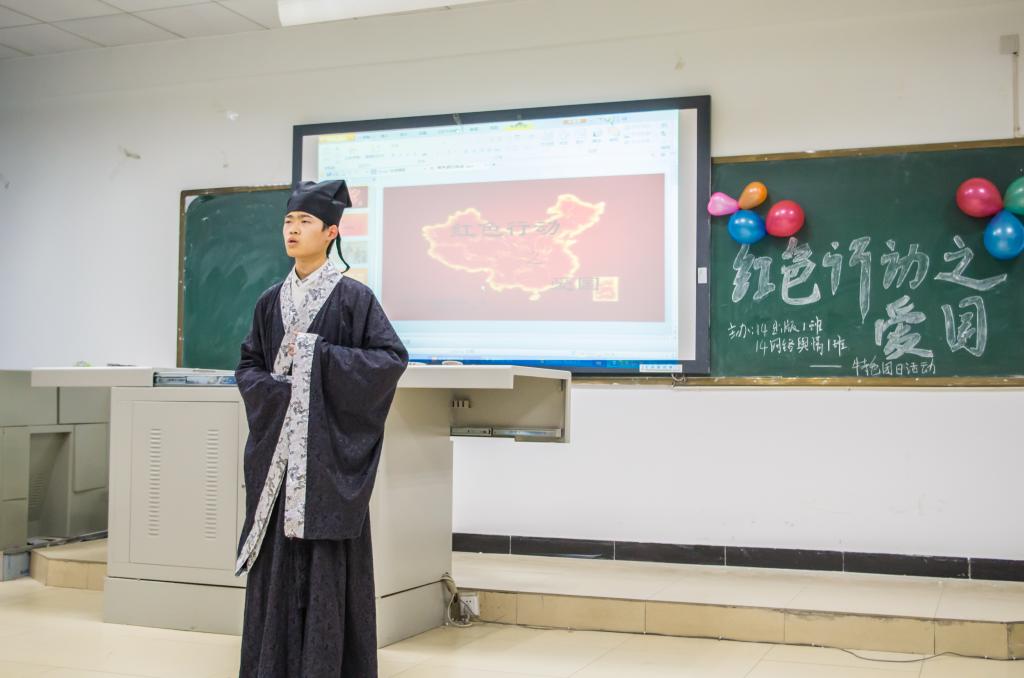 活动在高亢嘹亮的中国共青团团歌中拉开帷幕。出版与发行专业的陈翔身着汉服,在古乐的伴奏下朗诵诗歌《为汉服的浅吟低唱》,他激昂的声音赢得了全场观众热烈的掌声,传达的爱国情感感染了在场所有的人,同时也让大家对传统服饰有了新的认识。随后表演的话剧《戊戌变法》让大家身临其境地感受到康有为等革命志士在国家民族危机,生死存亡之时改革变法,救亡救国的满腔热血。最后,活动在“国家历史发展”有奖竞答中结束。
