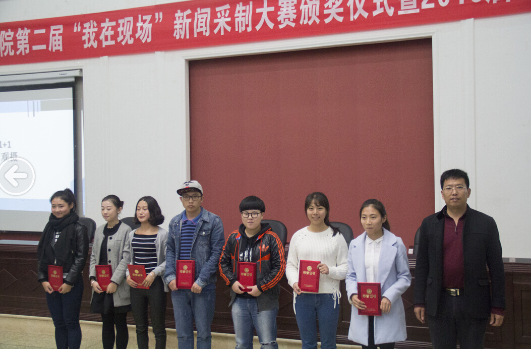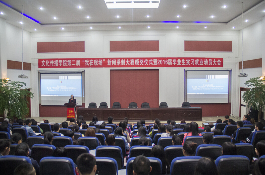 11月5日下午,我院第二届“我在现场”全媒体新闻采制大赛颁奖仪式暨2016届毕业生实习就业动员大会在二教105室举行。校领导曹启富,我院党总支书记、院长郭光海,党总支副书记舒畅,分团委书记、学生科负责人毛浩杰,新闻采编与制作专业负责人母华、大赛的获奖代表和2016届全体毕业生参加会议。