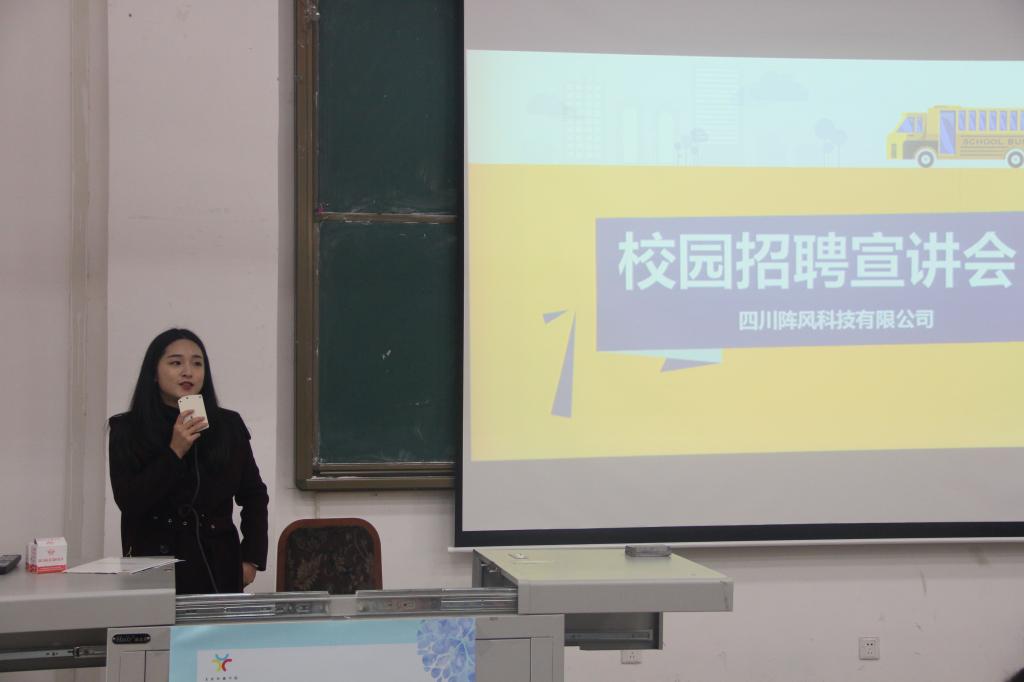 11月16日下午,我院在三教213举办2018届毕业生展选会文化传播学院分会场集中宣讲会。参加本次宣讲会的企业有四川新闻网“麻辣社区”、上海夙阑企业管理咨询中心、资阳大众网、成都天驱科技有限公司“大天府网”、四川阵风科技有限公司等。我院2018届全体毕业生参加了宣讲会。大会由就业干事汪未晗主持。