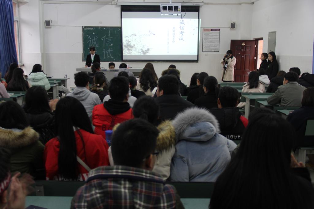 为严肃考风考纪,加强学风建设,培养学生诚信考试意识,1月5日中午,我院在三教311召开了诚信考试动员会。我院学生科负责人、分团委书记毛浩杰,辅导员孙小清、董文丽、王玥琪、全体团学成员及各班班干部参加动员大会。会议由学习部干事李晓雨主持。