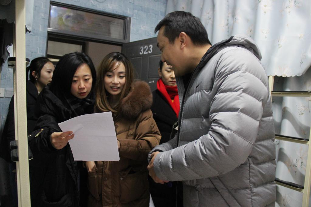 1月11日下午,我院党总支副书记舒畅带领学生科负责人毛浩杰、辅导员孙小清、范贤彬、王玥琪、董文丽、孙艺钊以及学生宿舍管理委员会成员开展了期末宿舍安全隐患排查工作。
