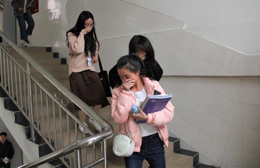培训会上,陈燕鸿普及了基本的防火知识,讲解了迅速撤离法、低身前进法、毛巾捂鼻法等逃生方法。她还解释了干粉灭火器原理和使用方法,并展示了灭火步骤。随后,消防应急演练正式开始,警报声拉响之后,同学们迅速、有序地进行疏散,大家尽量将身体放低,捂住口鼻按应急逃生路线紧急撤离教学楼,并在三教楼下整队集合。