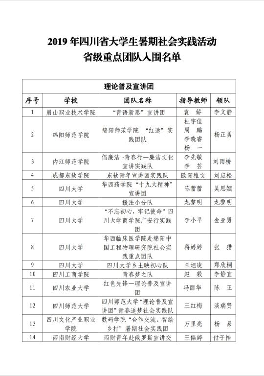 近日,文化传播学院2019年暑期社会实践团队“理想投递”实践团凭借“禁毒防艾宣传”专项活动入选四川省大学生暑期社会实践活动省级重点团队。