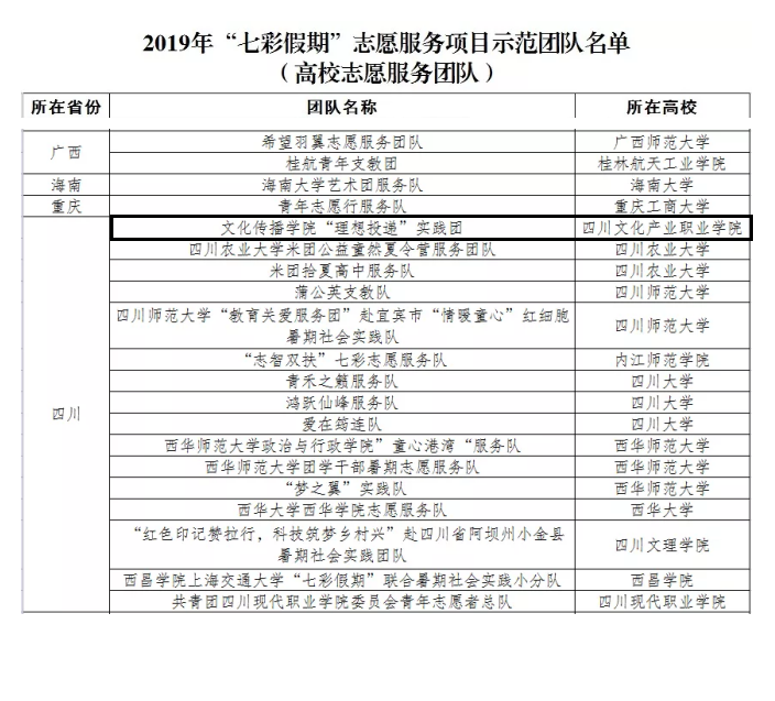 12月27日,由共青团中央、中央文明办、教育部、民政部下联合部署的2019年全国“七彩假期”志愿服务示范项目成果揭晓。经过重重筛选,我院“理想投递”实践团队荣获志愿服务项目示范团队称号,成为我校唯一获此荣誉的团队。