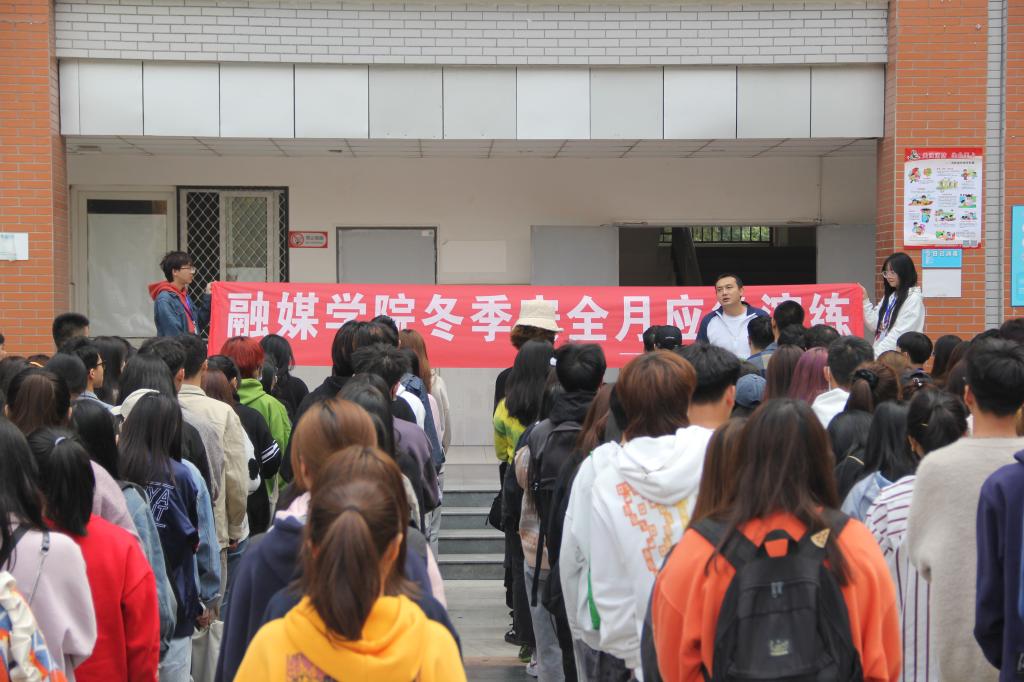 会上,主持人对相关防火知识进行普及,并讲解“迅速撤离法”、“低身前进法”、“毛巾捂鼻法”等逃生方法,解释干粉灭火器原理和使用方法,展示灭火步骤。演练现场,警报拉响后,指挥人员沉着冷静,全体师生反映敏捷,用湿毛巾或手捂住口鼻,将身体放低,迅速、有序地进行疏散,并按应急逃生路线紧急撤离教学楼,在三教楼下应急集合点整队集合。