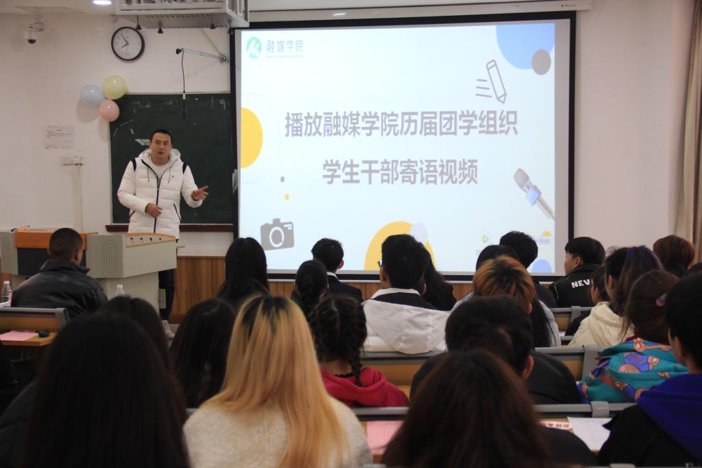 此次会议有“听取上一届共青团融媒学院委员会工作报告”“投票选举共青团融媒学院新一届任委员”“为上一届分团委成员颁发聘书及表彰”等10项议程。受疫情影响,我院往届学生干部通过云端视频录制寄语,送上祝福与期许并祝愿融媒学院第一届团代会、学代会顺利召开。