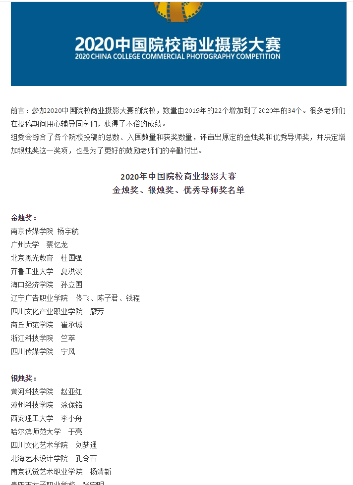 融媒学院摄影摄像技术专业师生在中国院校商业摄影大赛中获得多个奖项。该大赛由中国院校商业摄影大赛组委会主办,第四届大赛于2020年12月开始面向全国院校征稿,截止投稿日期2021年4月15日,共有34所院校参与。