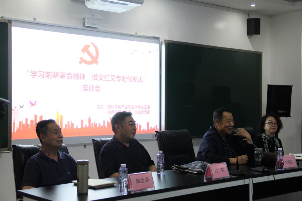 为庆祝中国共产党成立100周年,进一步深入学习贯彻习近平总书记在党史学习教育动员大会上的重要讲话精神,教育引导青年学子深入理解党史,增强责任感与使命感,6月17日下午,我校关工委、融媒学院党总支和学生党支部共同组织的“学习前辈革命精神,做又红又专时代新人”党史学习教育座谈会在颖艺楼308室顺利举行。曾任中共四川省委委员、省委党校常务副校长李锡炎,曾任四川省干部函授学院党委委员、副院长付荣,曾任四川广播电视学校校长魏全森三位退休老党员莅临本次座谈会。学院党总支书记卢隽主持会议,学生党支部书记王玥琪、纪检委员王维亚及45名入党积极分子参加座谈会。