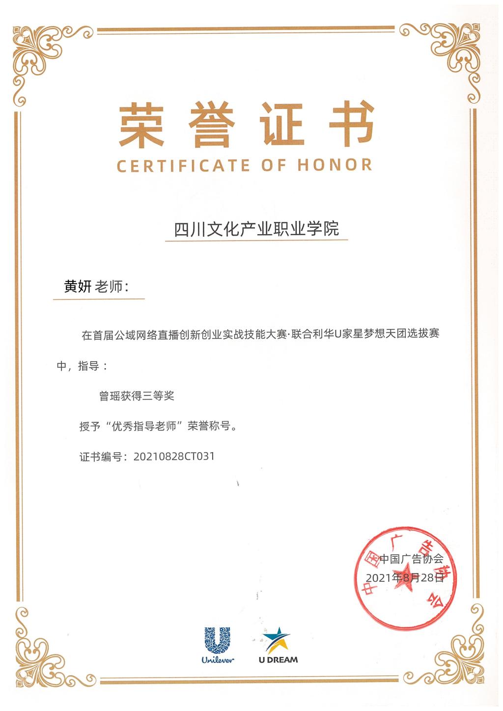 本届公域网络直播创新创业实战技能大赛,共有来自全国近30个省份、50多个院校、约400名同学参赛。大赛从6月开赛持续到9月,从发布产品试用笔记的小红书赛到“我的一天”抖音赛,由中广协和联合利华共同审核最终比赛成绩。经过数月的奋战,我院新闻采编与制作专业曾瑶学生荣获三等奖,指导教师黄妍被授予“优秀指导教师”荣誉称号。