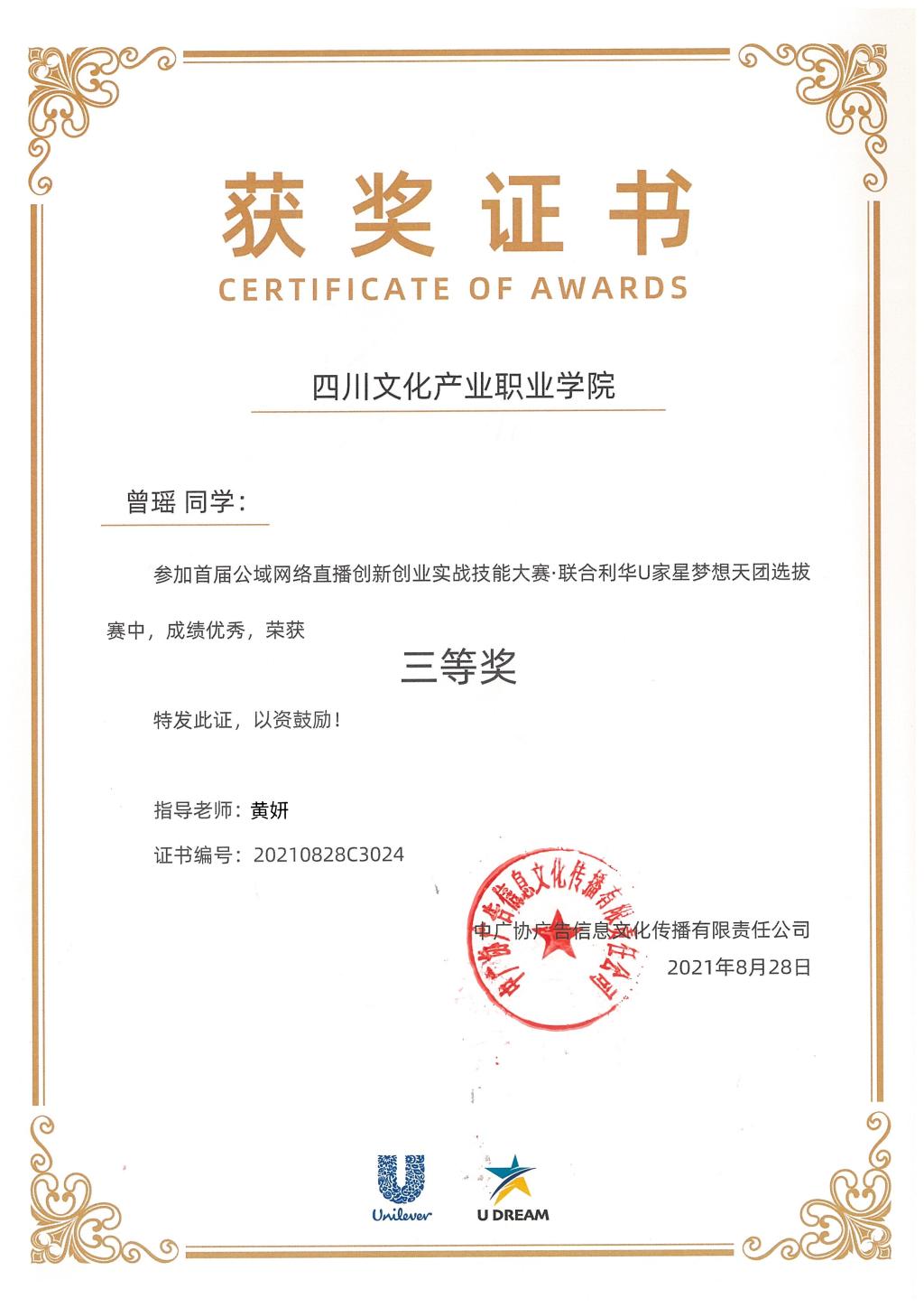 本次大赛由中广协广告信息文化传播有限责任公司主办,中广协网络直播产教融合中心、中广星领(北京)文化信息科技有限公司承办,携手全球知名品牌联合利华联合举办。此次比赛培养了参赛学生运营个人账号以及内容策划与创作的能力,同时也增强了学生勇于参赛竞争的精神和不断学习的动力。一直以来,我院积极探索职业教育发展规律,开展校企合作,产教融合,推行“以赛促教,以赛促学”理实一体的教学模式,鼓励师生参加各种赛事,围绕高质量高水平发展,为社会培养更多优秀的技术技能人才。