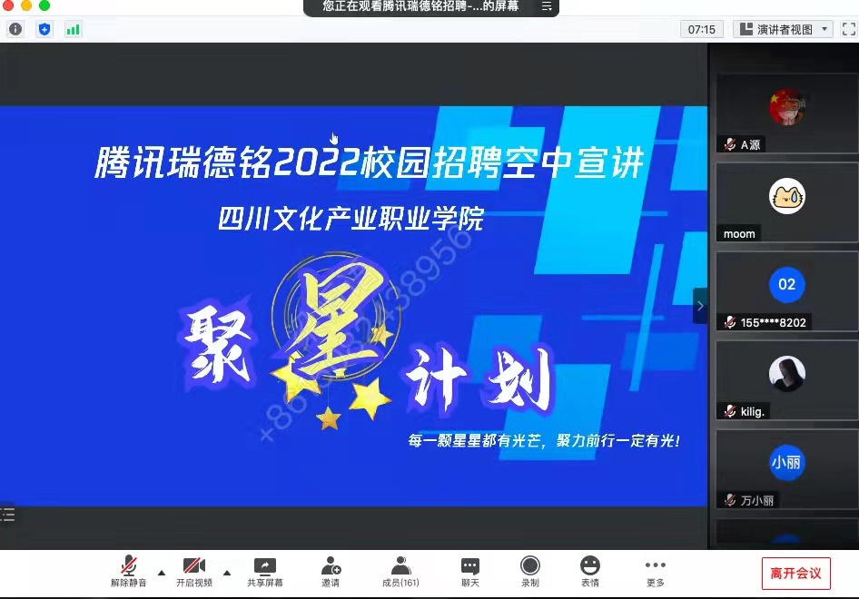 11月16日中午,融媒学院联合腾讯公司开展了“腾讯瑞德铭2022校园招聘空中宣讲会”。本次会议由融媒学院党总支副书记邹渝主持,近200名融媒学院2022届毕业生报名参加了此次宣讲会。
