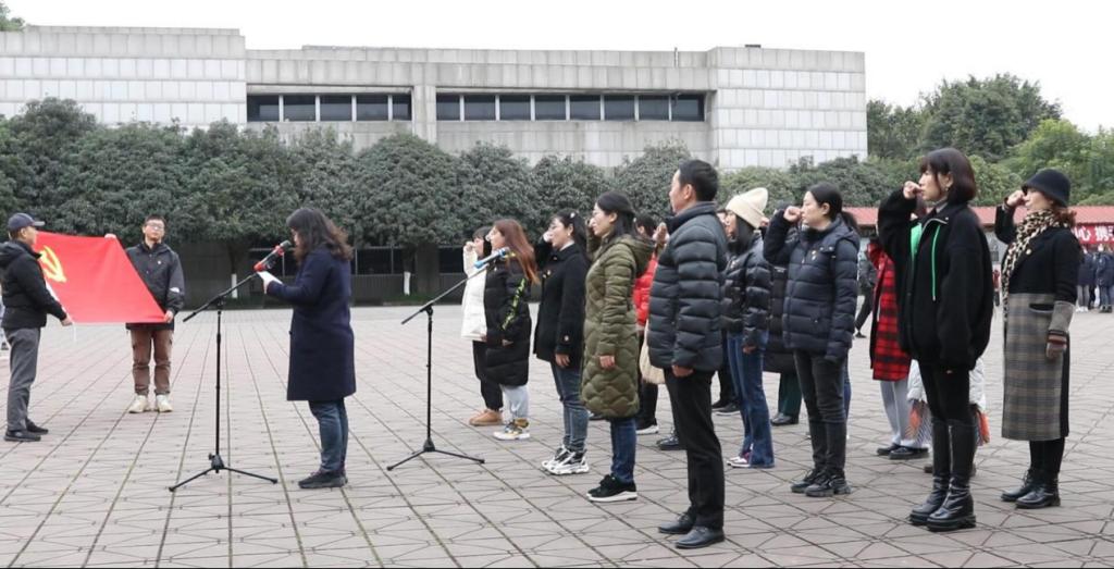 走出展馆,全体党员教师在中流砥柱馆的小广场上,党员举起右手,由宣传组织委员引领,在鲜红的党旗下庄严重温入党誓词。各党小组分别参观了抗战老兵手印广场、川军抗战纪念馆、邓公祠、红军长征在四川等场馆,开展了形式多样的主题文艺活动。第一党小组和第二党小组激情洋溢地朗诵了满载百年中国梦想的诗歌《一叶红船》。第一党小组党员张浩在川军抗战馆声情并茂地给大家讲解了川军各派系响应刘湘出川抗日号召,整装待发,出川杀敌。作为祖国的大后方,巴蜀儿女踊跃保家卫国,出了三分之一的军粮,出了三分之一的钱币,出了三百余万战士,出了三百余万工役,艰难困苦,始终不渝,直到把日本侵略者驱逐出境。第三党小组党员认真参观建川博物馆红手印广场,了解抗战故事,声情并茂地朗诵诗歌《我爱你中国》,表达了对祖国母亲赤诚的热爱、对抗战英雄由衷的崇敬与感激。第四党小组在参观“红军长征在四川”一个个逼真的复原场景时,触景生情,朗诵了长征组歌中的“过雪山草地”,参观红军过草地的苦难历程后,深情演唱了《我的祖国》。