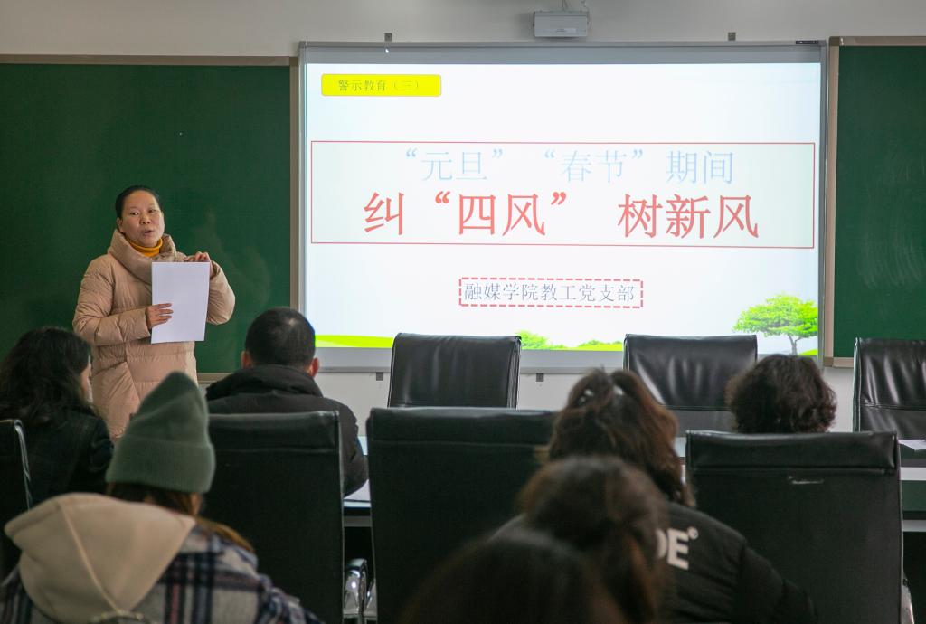 1月4日上午,融媒学院教工党支部在颖艺楼308党员活动室开展“纠‘四风’、树新风”警示教育活动,全体教师参加了教育学习。