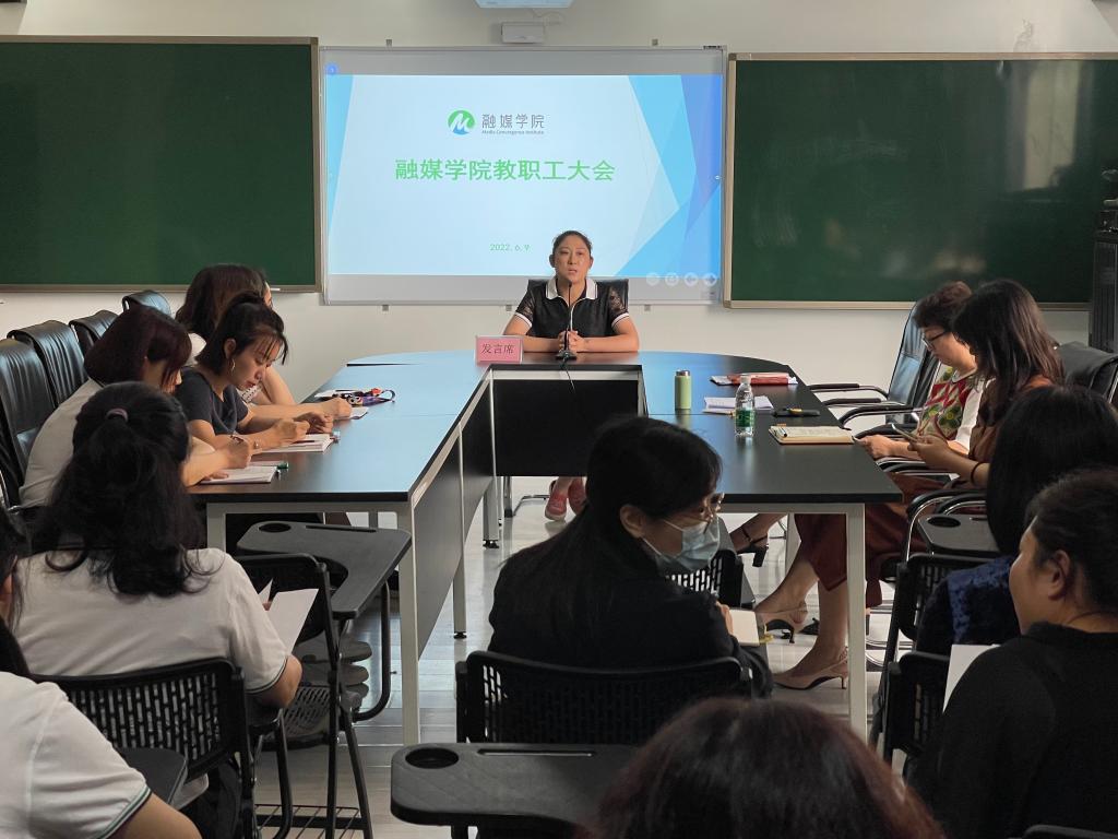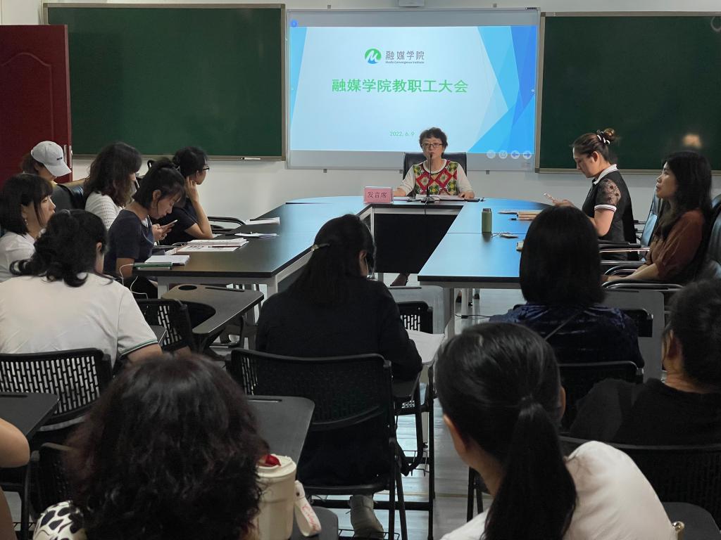 6月9日下午,融媒学院在颖艺楼308室召开全院教职工大会并进行教师培训成果交流。融媒学院党总支书记卢隽、副院长唐颖及全体教师参加会议,会议由院长秦勉主持。