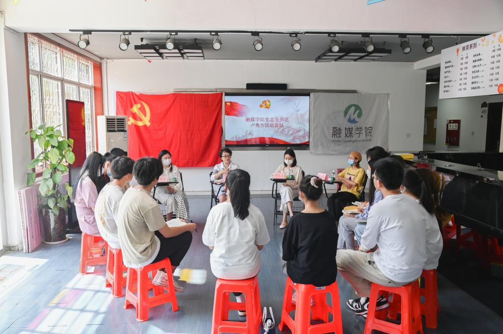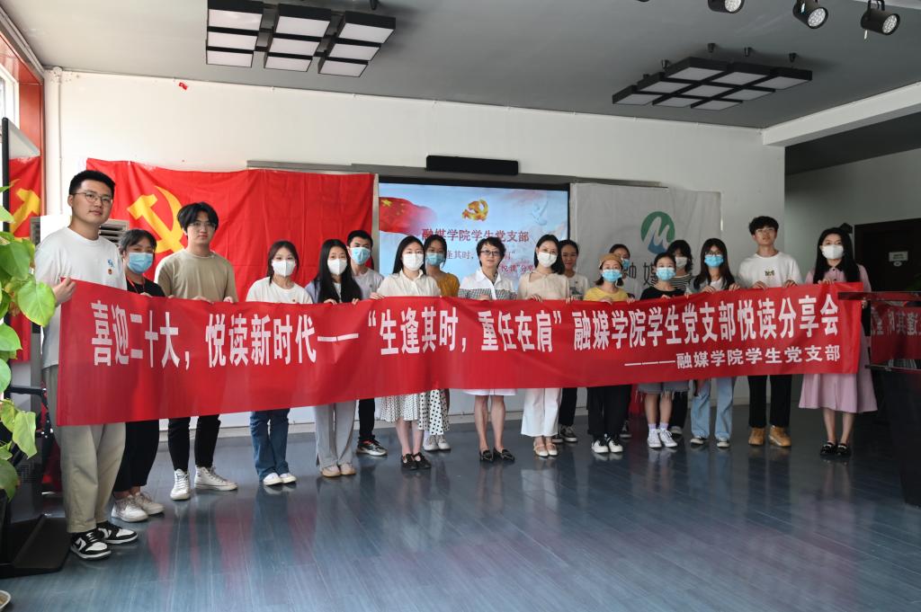 为学习贯彻习近平新时代中国特色社会主义思想,引领融媒学院学生党支部成员学习习近平总书记重要讲话:坚定紧跟党走,铸就红色青春。
