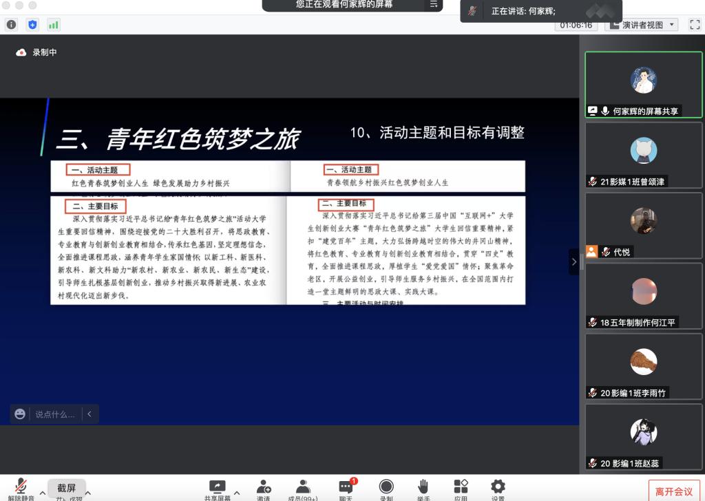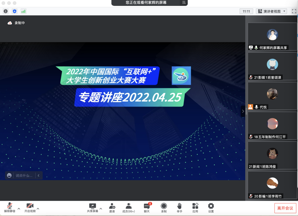 为深入贯彻落实习近平总书记关于教育的重要论述,对标学校“双高”建设,全面深化高校创新创业教育改革,帮助融媒学院学生进一步深入了解“互联网+”大学生创新创业大赛相关政策及热点,针对“以赛促学、以赛促教、以赛促创”的大赛目的,4月25日19时30分,我院特邀湖北工业大学工程技术学院的何家辉副教授(博士)开展专题讲座。讲座由创新创业干事杨玉霞主持,院长秦勉、副院长唐颖、多位专业老师及近500名同学参与。
