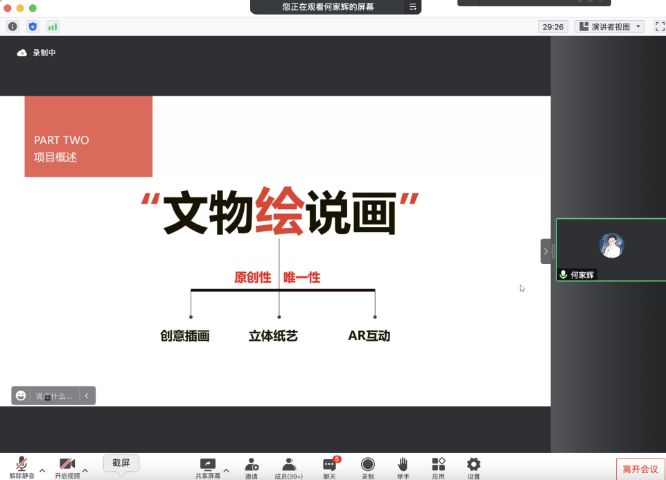 根据“我敢闯我会创”的主题,何家辉针对本次“互联网+”大赛的规则进行简要介绍,为大家讲解各个不同赛道相关规则及评判标准。通过案例解析,“文物绘说画”的项目拆解与概述,将自己参与大赛多年的宝贵经验分享给大家。他提到:“人无我有、人有我优、人优我特”,在国家的大力支持与国家文化发掘的时代背景下,我们更应不断整合创新;同时积极连接学校、企业、政府等相关平台;实现从作品到产品、从产品到商品的完美闭环,再呈辐射状的形式到公益上。