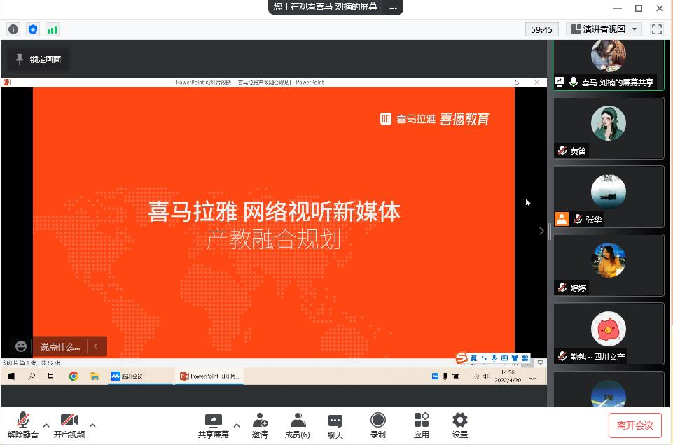 4月20日下午,融媒学院与喜马拉雅科技有限公司相约线上,举行了一场线上座谈会。融媒学院院长秦勉、就业干事张浩、网络直播与运营专业负责人黄笛出席了本次线上座谈会。喜马拉雅科技有限公司由喜马拉雅城市文化总监郑婷婷、线下业务商务总监刘楠、线下业务四川地区经理张华出席。我院与喜马拉雅科技有限公司在产教融合、项目开发等多个方面在前期已形成合作意向。