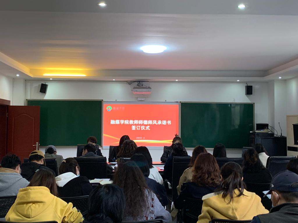 为进一步加强融媒学院教师队伍建设,全面贯彻为党育人、为国育才的使命担当,落实立德树人根本任务,加强教师思想政治工作和师德师风建设。4月15日,融媒学院在颖艺楼308开展了教师师德师风承诺书签署活动。融媒学院全体教师参加了此次活动,活动由学院党总支书记卢隽主持。