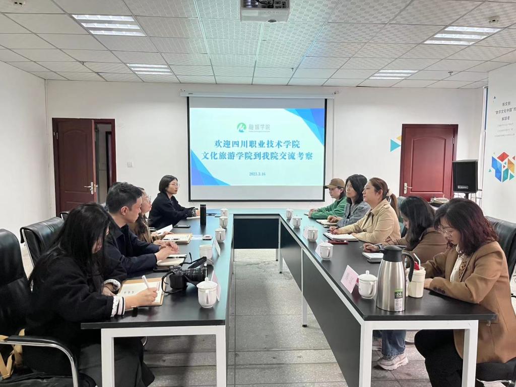 3月16日上午,四川职业技术学院文化旅游学院院长罗莹一行5人来我院就专业群建设、人才培养、技能大赛、1+X证书等进行交流,并参观了实训室。融媒学院院长秦勉、副院长唐颖参加交流考察。