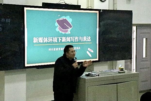 2024年12月18日上午10:00,由融媒学院2023级新闻采编与制作专业举办的“新媒体环境下新闻写作与表达”讲座在二教106教室拉开帷幕。本次讲座邀请到了四川省教育融媒体中心新媒体责任编辑黄国兵作为主讲人。