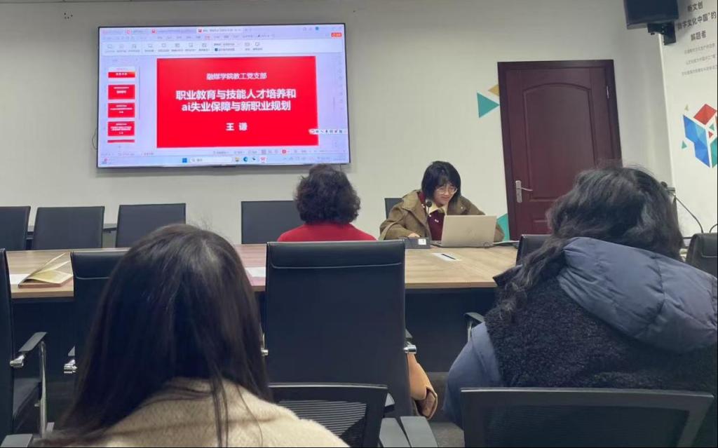 王谦同志围绕“职业教育与技能人才培养和AI失业保障与新职业规划”展开领学,进一步凸显了活动的创新性。她阐述了职业教育对国家产业升级的重要支撑作用,并深入剖析了AI发展带来的就业变化。这一内容紧密关联党和国家关于促进职业教育发展的方针政策,将政治学习延伸至就业服务领域,切实提高党员教师对服务社会、服务学生重要性的认识,扎实做好应届毕业生就业工作。