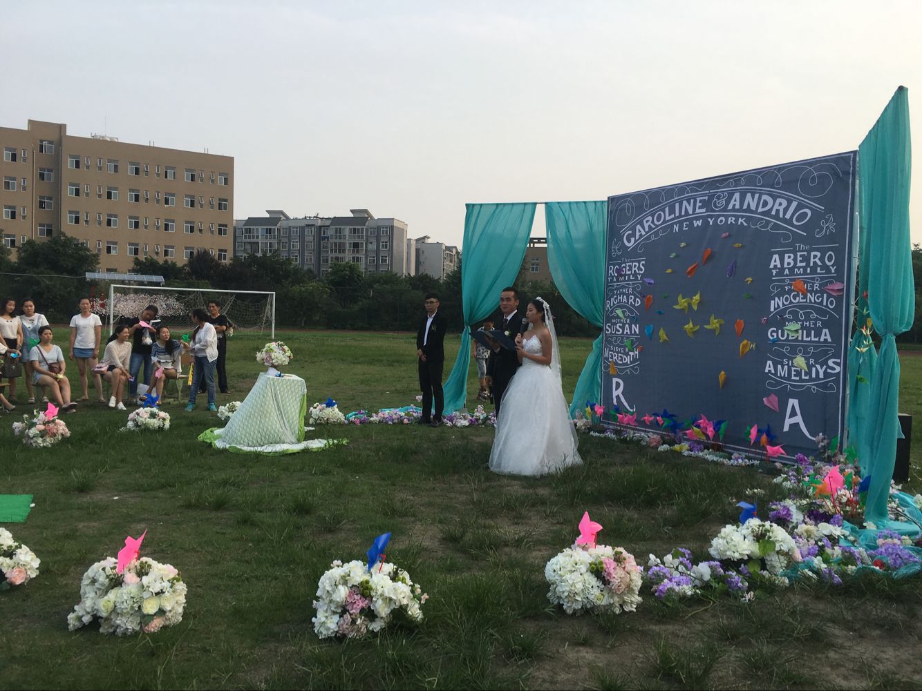 在学校足球场,由另外22位婚庆专业的学生带来了一场以“校园青春“为主题的西式婚礼。“千纸鹤、风车、课桌、气球”等极具校园元素的饰品,由同学们全手工完成,着实让在场的观众感受到了充满活力的校园气息。