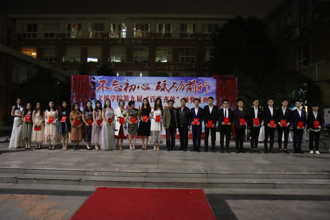 近日,文博学院举办了“永远跟党走—不忘初心、砥砺前行”第九届“百花齐放”颁奖盛典。学生工作部副部长、校团委书记黄自立,我院副院长陈其余,党支部书记、教务科副科长汪泽仁,学生科负责人王力,以及我院师生代表,各学院学生干部代表,全体团学干部及大一新生参加了本次活动。