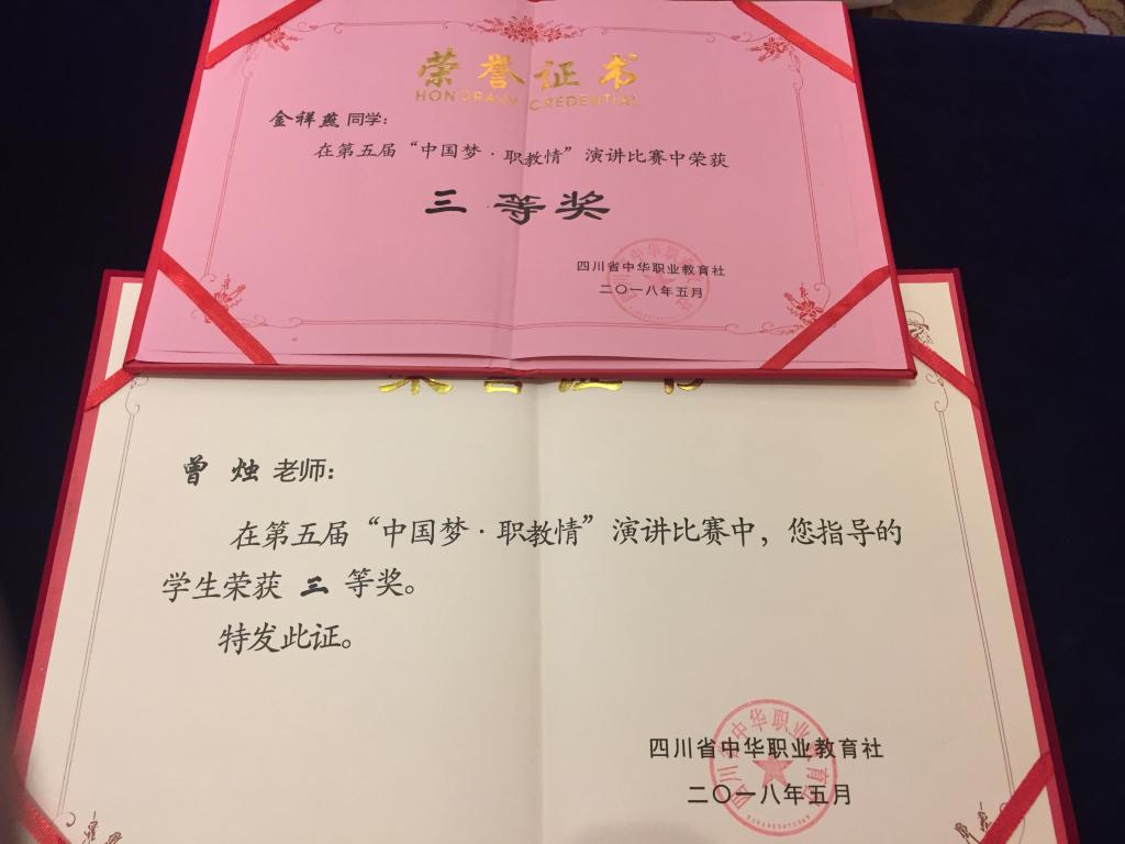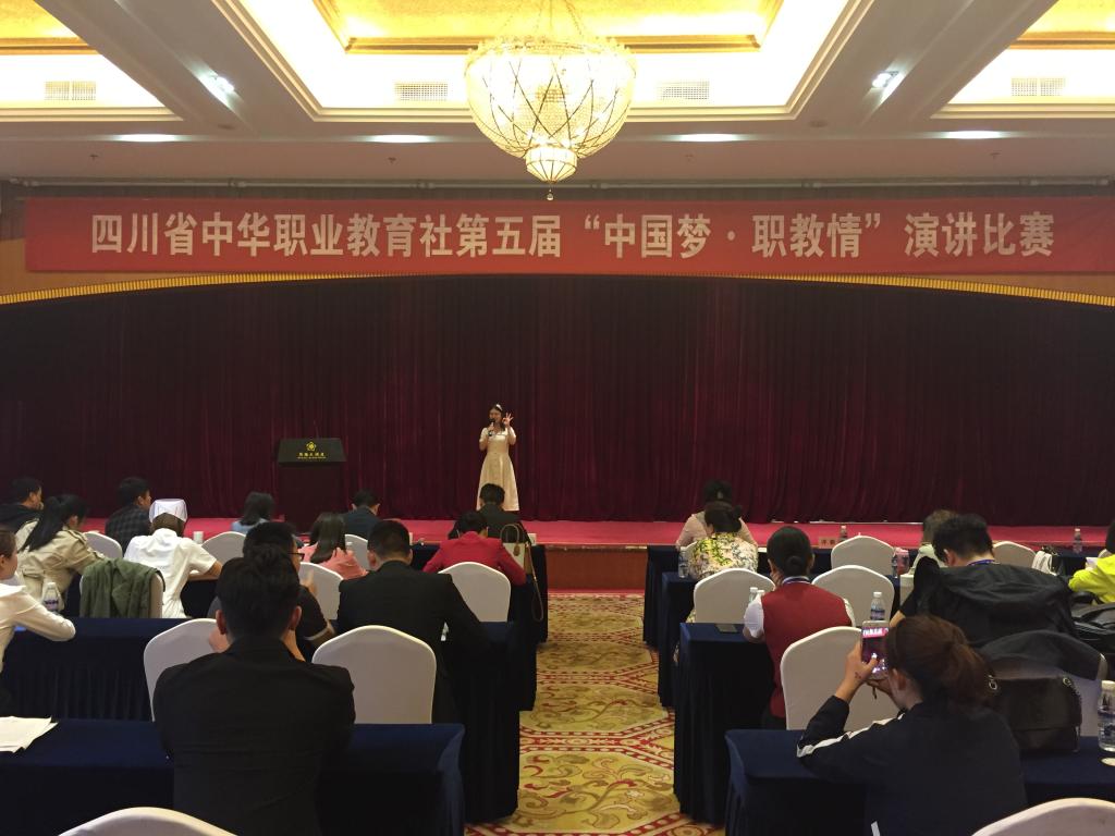 5月11日,由四川省中华职业教育社主办的第五届“中国梦•职教情”演讲比赛在德阳举行。来自全省的15所高职院校、20所中职学校参加了比赛。经过激烈角逐,我院2016级婚庆服务与管理专业的同学金祥燕,在婚庆服务与管理专业教研室教师曾烛的指导下以94分的好成绩获得高校组三等奖。