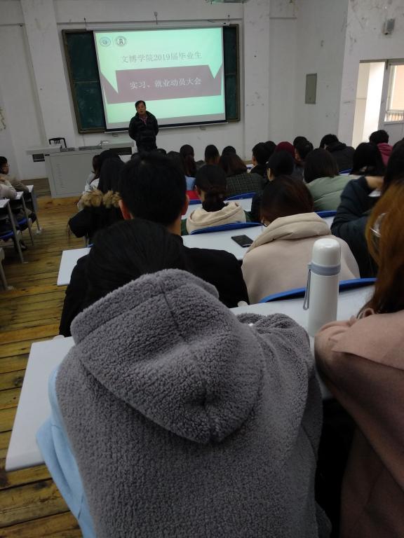11月29日中午12:30,我院在三教213教室举行文博学院2019届毕业生实习、就业动员大会。文博学院副院长陈其余、就业指导老师刘燕,辅导员马遵义参加了本次会议。