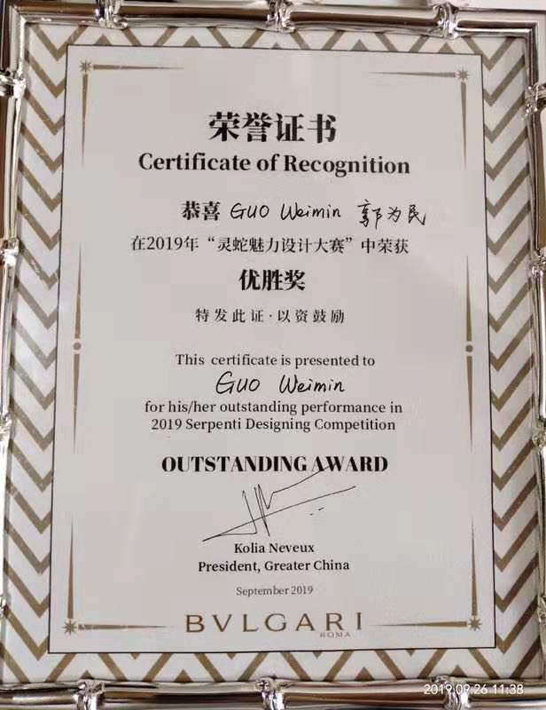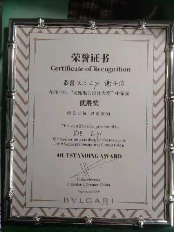 据悉,本次设计比赛为宝格丽第一届校企合作设计大赛,在与四川美术学院等数所院校的激烈角逐中,郭为民、谢子怡获得优胜奖。在颁奖时,宝格丽首席执行官Mr. Jean-Christophe Babin对同学们的设计天赋表示大力赞赏,对同学们的到来表示热烈欢迎,并希望有机会与同学们签署合作协议,将设计图稿生产为产品。