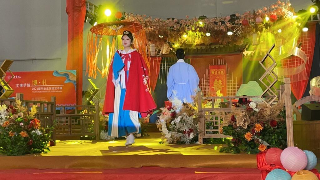 “礼.婚礼秀”由“民族婚礼、汉式出阁礼、新中式婚礼”三场不同风格的婚礼秀组成。从异域风情的维吾尔族婚礼到汉式传统婚礼中的出阁礼再到新中式传统婚礼的完美呈现,舞台设计及搭建精美,道具和婚礼风格定位统一,展现了婚庆学子们扎实的专业知识,穿插华丽庄重的汉服大秀、国乐歌舞更加丰富了整场婚礼秀的内涵。