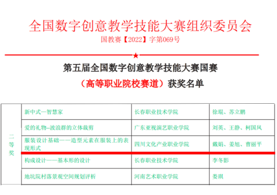 6月15日,第五届全国数字创意教学技能大赛评选结果揭晓。文博学院服装与服饰设计专业“课程思政”示范课程“服装设计基础”教学作品《造型元素在服装上的表现形式》(姜旭设计、戴娟主讲、曹丽平参与)荣获教育部中国高等教育学会《全国普通高校教师教学竞赛榜单》第五届全国数字创意教学技能大赛“二等奖”。