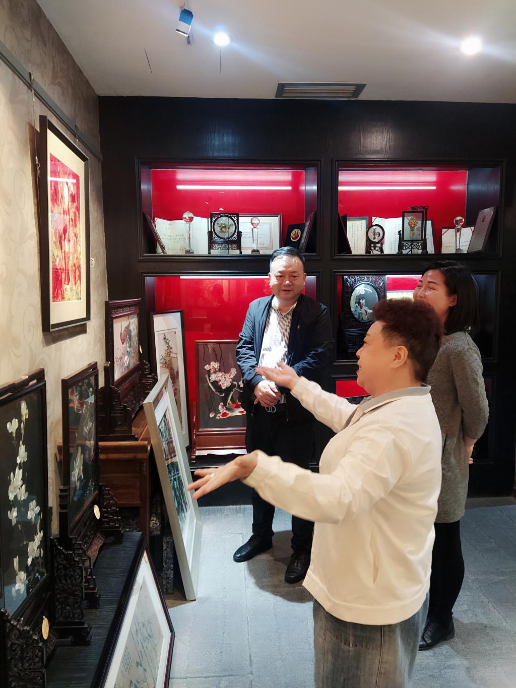 杨德全大师带我们参观了馆藏蜀绣作品,讲述作品背后的故事,以及蕴藏在针线之间的艺术语言和文化内涵,让人叹为观止。本次调研受益颇丰,双方在人才培养、顶岗实习、产品研发、大师工作室、文化传播等多方面展开交流,达成了校企合作意向,为学院双高建设和人才培养工作打下良好基础。