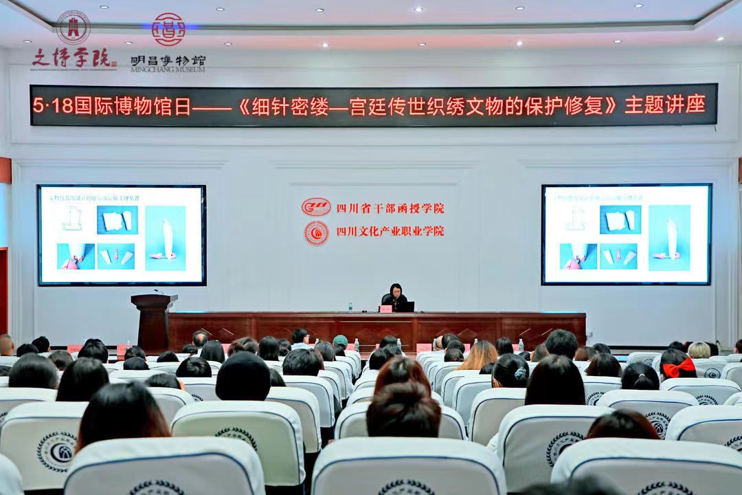 5月18日10时,由四川文化产业职业学院、四川天府新区文创和会展局、农工党四川天府新区支部、四川天府新区文学艺术界联合会主办,四川文化产业职业学院文博学院、成都市天府新区明昌博物馆、四川天府新区改革创新研究院、四川天府新区华阳街道办事处、巴蜀文化社区大学承办的5.18国际博物馆日主题讲座“细针密缕—宫廷传世织绣文物的保护修复”在我校二教105举办。故宫博物院文物保护标准化研究所副所长、研究馆员陈杨受邀主讲。天府新区文联、华阳街道、学校各处室领导、文博学院文物修复与保护、服装与服饰设计专业师生听取了讲座。