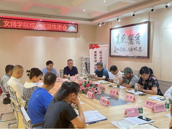 2023年7月3日中午,文博学院在创慧楼二楼会议室召开双高建设工作推进会,文博学院党总支书记唐天卿主持会议,院长岳湛、各双高项目负责人及项目联络员参加会议。
