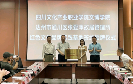 2023年7月12日上午,四川文化产业职业学院和张爱萍故居管理所(神剑园)在达州市通州区举行了“红色文化教育品牌实践基地”签约与授牌仪式。文博学院党总支书记唐天卿、院长岳湛、文创专业主任钟谋、产品设计专业主任李彦斌,达州市通州区文旅局副局长田松元、张爱萍故居管理所党支部书记、所长向俊俐等人出席了签约仪式。