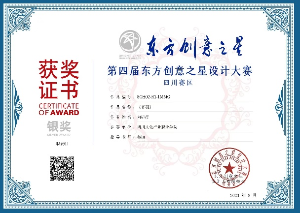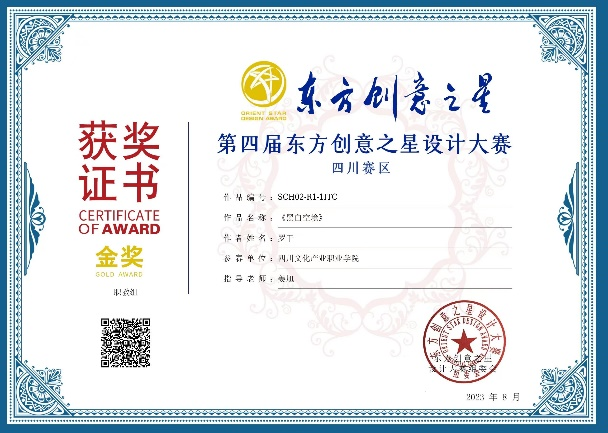 8月中下旬,由工业和信息化部国际经济技术合作中心批复举办的第四届东方创意之星设计大赛(四川赛区)获奖名单揭晓,本届大赛四川赛区共评出获奖作品260件,其中金奖28件、银奖54件、铜奖178件。我院服装与服饰设计专业2020级罗干服装设计作品荣获职教组金奖(全省唯一),2021级向钰晨服装设计作品荣获职教组银奖,教师姜旭荣获优秀指导教师奖。