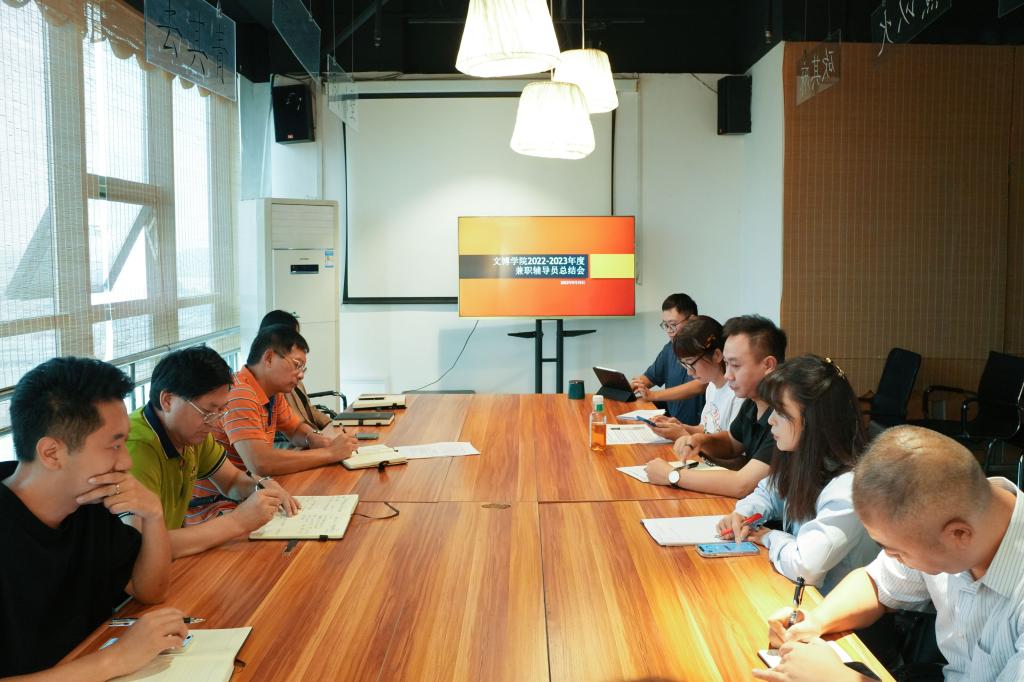 9月15日上午,文博学院在图书馆9楼会议室召开2022-2023年度兼职辅导员工作总结会。文博学院党总支副书记刘林主持会议,党总支书记唐天卿出席,全体专兼职辅导员与会。