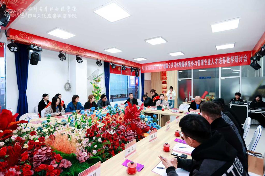 12月19日,四川省婚姻服务行业产教融合共同体暨婚庆服务与管理专业人才培养教学研讨会在创慧楼婚俗空间成功举办。四川文化产业职业学院团委书记兰楠、文博学院党总支副书记刘林、婚庆专业主任曾烛、四川省婚庆行业协会会长汪静、婚庆专业学科带头人王亦平等学校、行业代表出席。四川省婚庆行业协会副秘书长高媛担任会议主持。