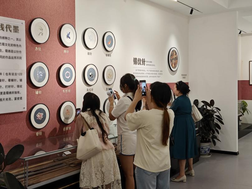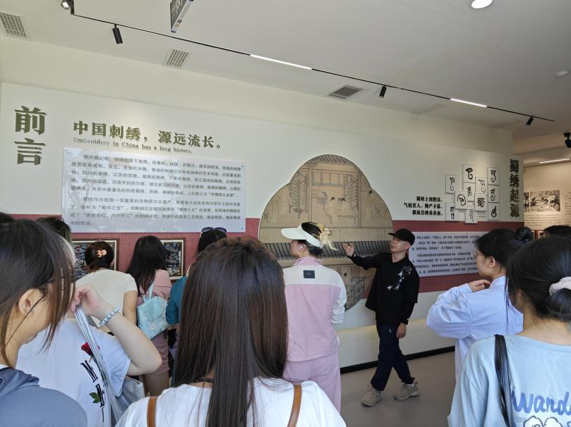 在蜀绣博物馆,王高杰介绍了不同时期蜀绣发展的历史脉络,从蜀绣的针法类型、艺术特点和设计应用等方面介绍了蜀绣的传承与创新发展。随后,师生参观了蜀绣服装设计和工艺美术品。