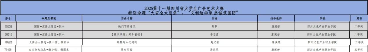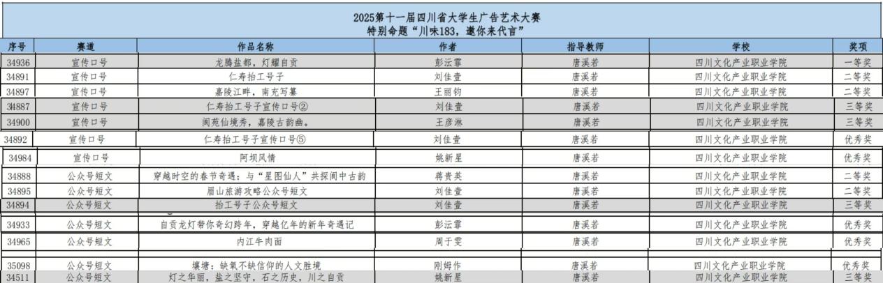 2025年9月,第17届全国大学生广告艺术大赛(四川赛区)暨第11届四川省大学生广告艺术大赛(特别命题)落幕。文博学院学子在大赛中表现突出,荣获一等奖1项、二等奖6项、三等奖6项、优秀奖5项。指导教师唐溪若受邀担任大赛特别命题评委。