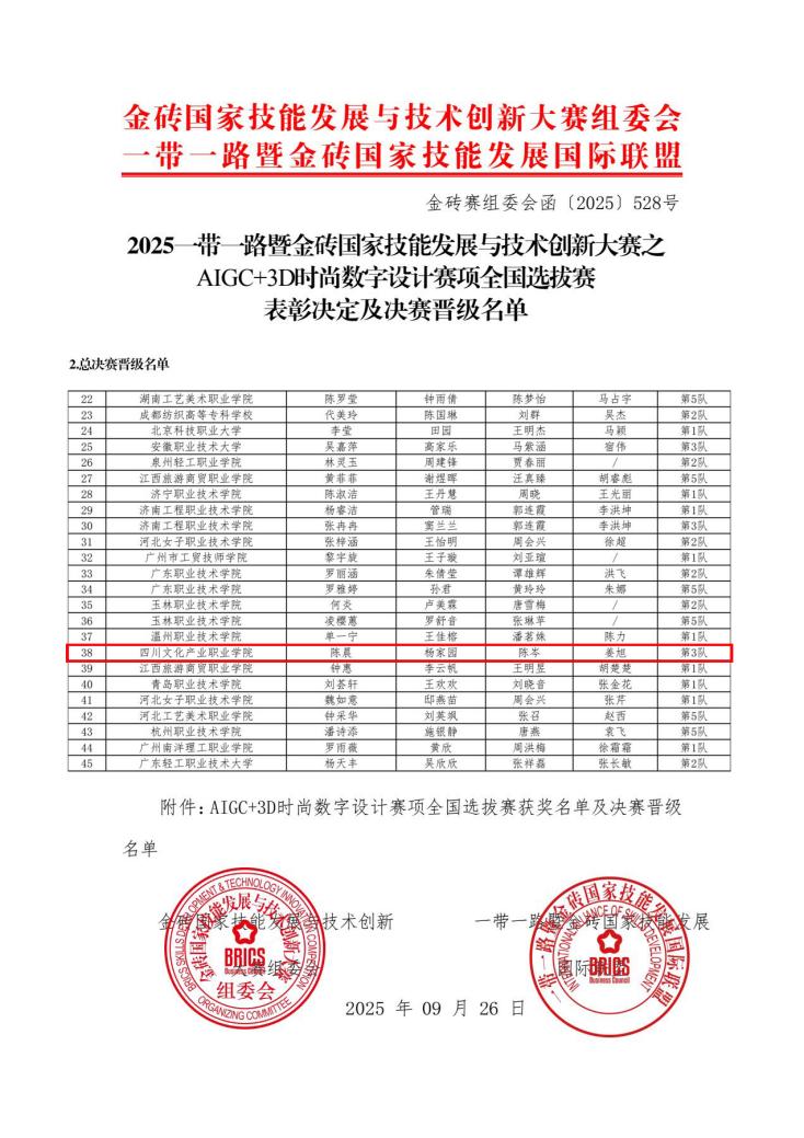 9月28日,2025“一带一路”暨金砖国家技能发展与技术创新大赛“AIGC+3D时尚数字设计赛项全国选拔赛”公布表彰决定及决赛晋级名单,文博学院服装与服饰设计专业参赛团队获得二等奖、三等奖、优秀奖,2024级学生陈晨、杨家园晋级国赛。