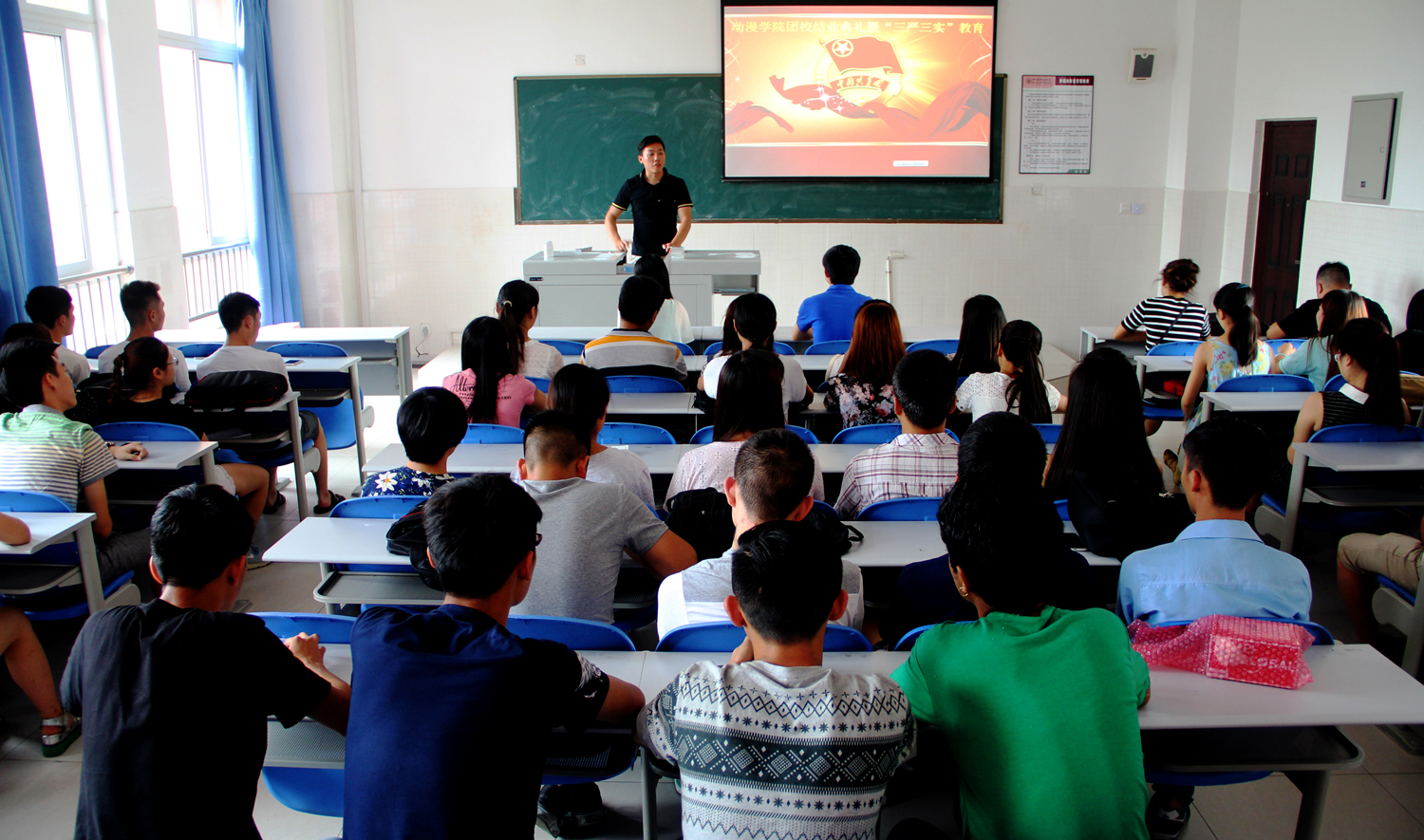 6月26日下午,我院分团委在第三教学楼210教室举行了第二届团校培训结业典礼暨“三严三实”专题教育会。我院分团委书记唐雷,辅导员王倩俐参加本次活动。