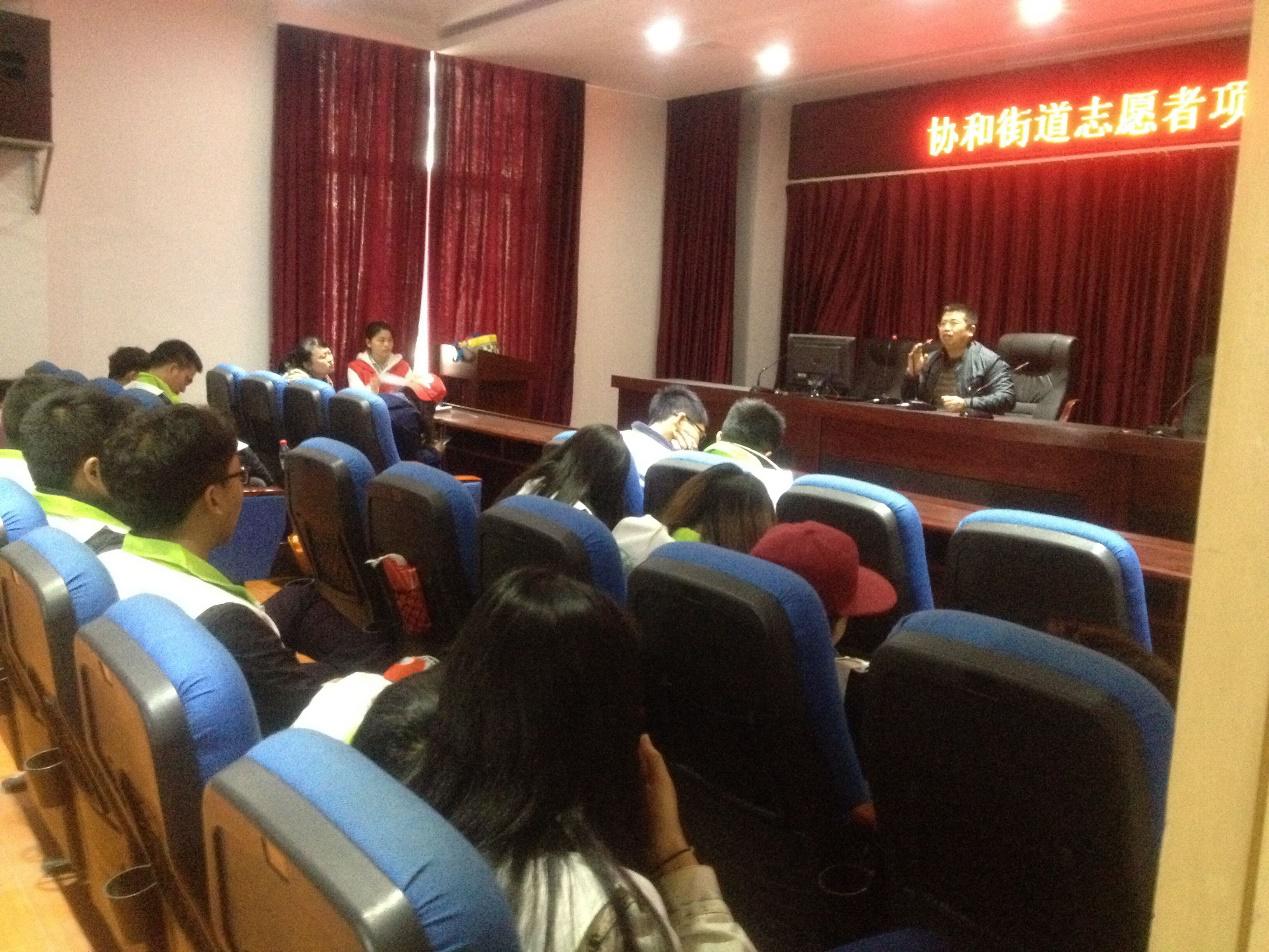协和街道社管中心徐泽林老师向志愿者们介绍了“朝夕相对”一对一为老服务、文明劝导、文化艺术培养等形式多样的志愿活动,并动员青年志愿者们积极参与,努力提高自身实践能力,将自己所学的知识与技能服务社会。