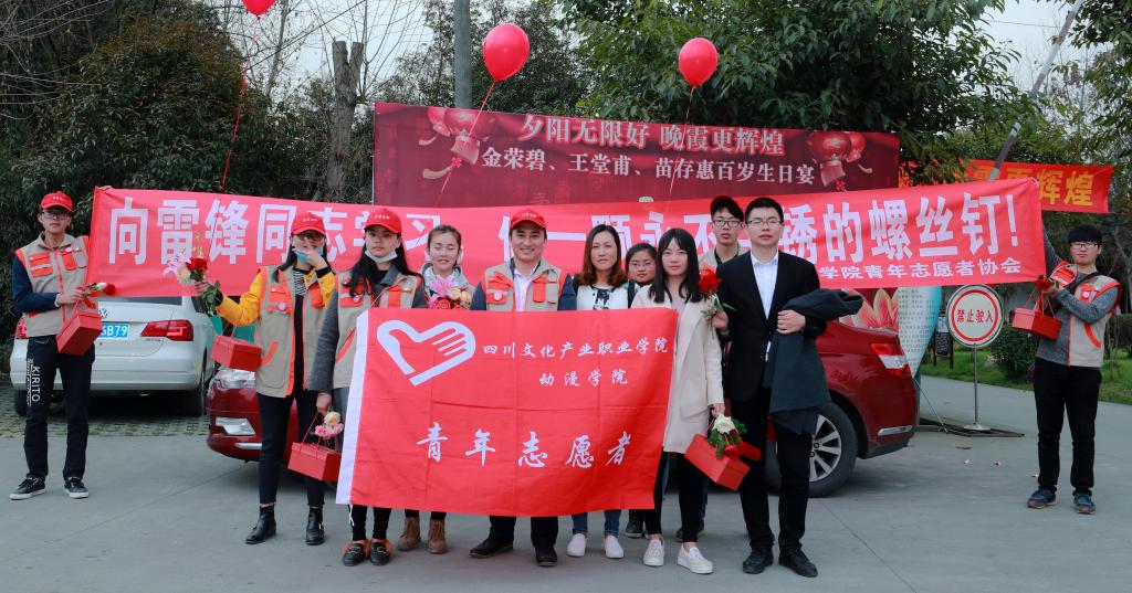 3月28日,动漫学院青年志愿者协会一行10人应邀到成都晚霞社会养老服务中心参加金荣碧、王堂甫、苗存惠三位抗战老兵的百岁生日宴。