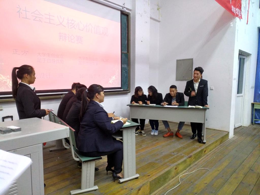 大会在《光荣啊,中国共青团》的歌声中开始,两队队员围绕着“大学生创业立足于自身优势还是立足于市场需求”进行了激烈的辩论,经过双方的唇枪舌战,反方2016级产品艺术设计专业以微弱优势获得了本次辩论赛的冠军,辩手刘禹同学获得最佳辩手。