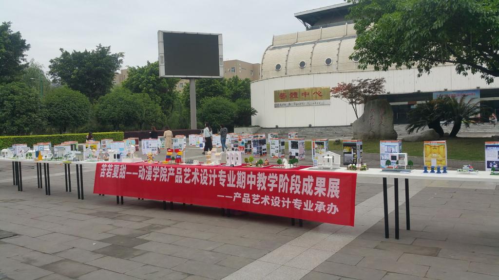 5月11日,由动漫学院产品艺术设计专业教研室主办,2016级产品艺术设计专业1、2班承办的“苦若夏甜”期中教学阶段成果展在艺体中心广场举办。