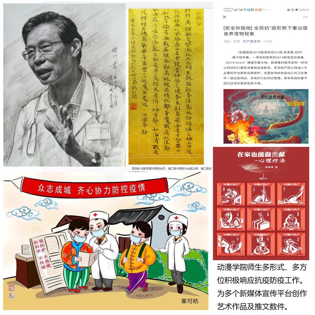 动漫学院大师工作室(李青版画文创工作室)的学员们用手中的刻刀和画笔,创作出抗击疫情版画作品十余幅,一刀一画皆是担当与爱国情怀。教师屈培泉创作的抗疫情书法作品《沁园春静》、《同气共盼 对联》、《齐心抗疫 对联》分别在民建四川省委、成都市文联、成都市书法家协会“万众一心 抗击疫情”主题书法网络展展出。学生党员罗豪、杜玉香发挥先锋示范作用,主动报名参加社区疫情防治志愿服务工作;青年团员陈家豪,石瑞涵,赵莹琦三人积极投入社区防疫志愿服务。